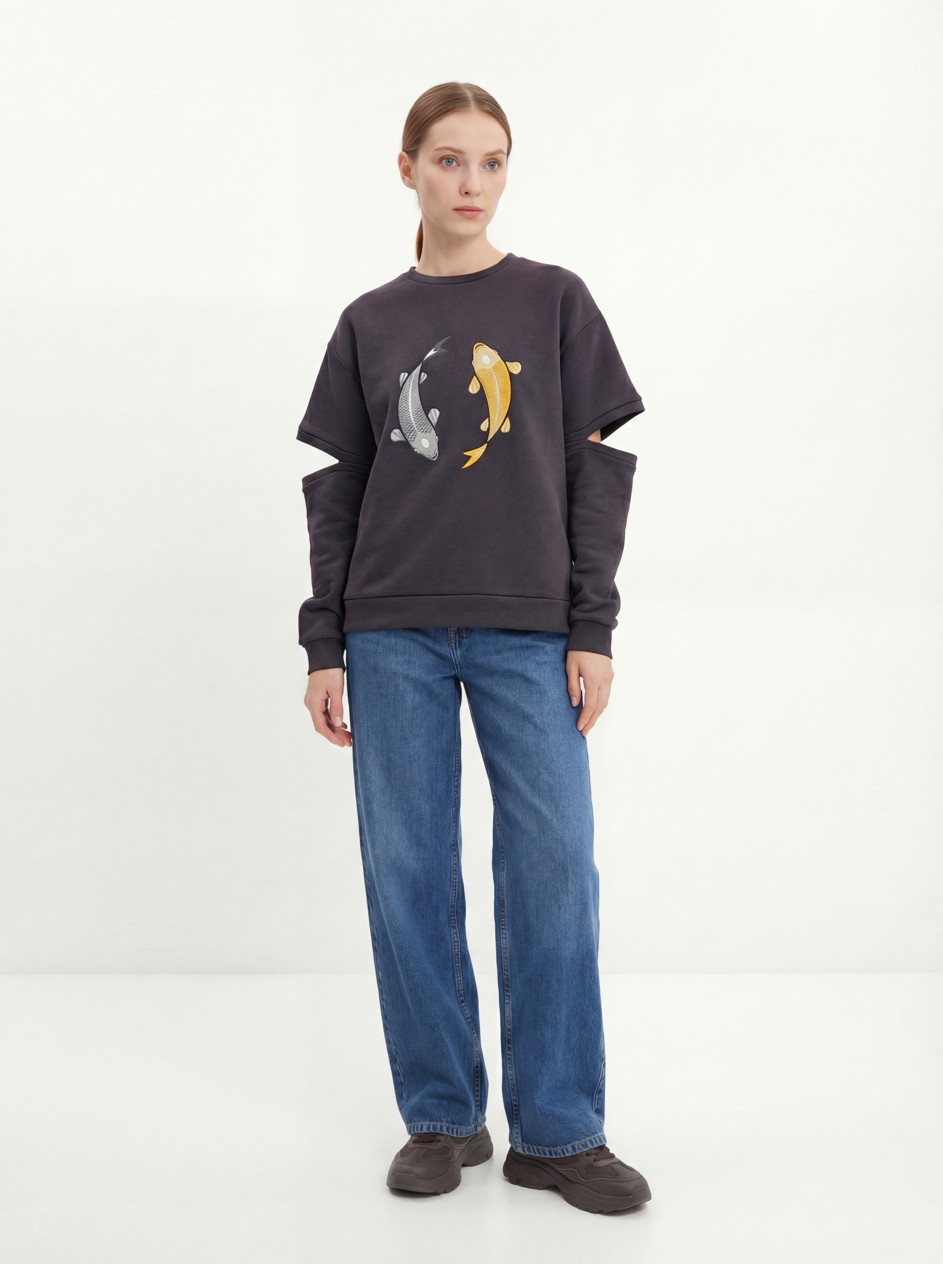 Авторская вышивка с рыбами кои добавляет изделию выразительный акцент и отражает философию бренда DEDÉ — баланс силы, движения и внутренней гармонии.